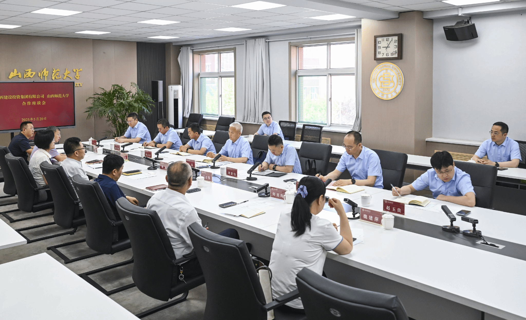 山西师范大学领导王志强、白文宏及学校党办、校办、后勤管理部、基建部负责人,集团市场开发部、四建集团、五建集团负责人参加会谈。