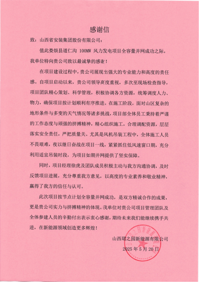 项目的高质量建设获得了业主单位的高度认可,并收到书面表扬信。