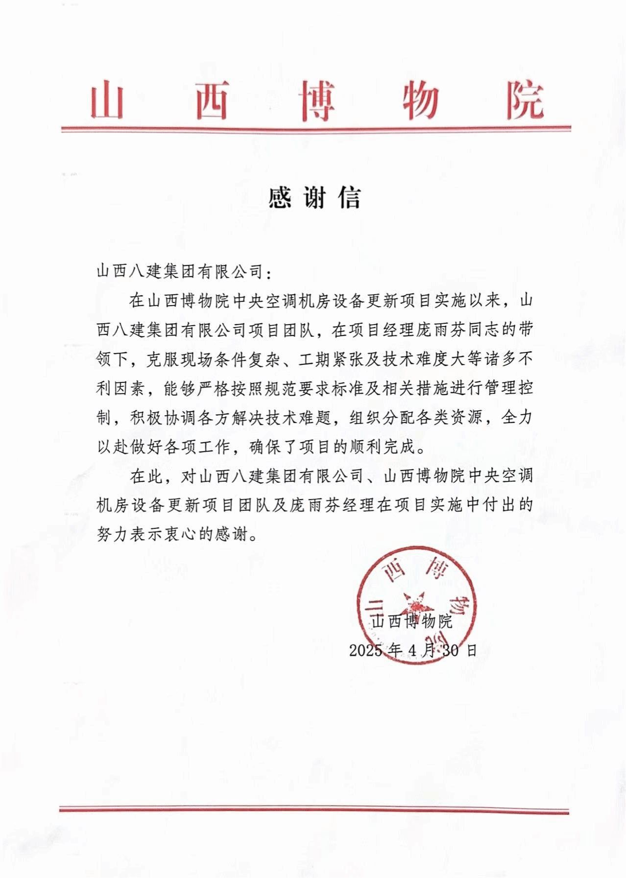 八建集团承建的山西博物院中央空调机房设备更新项目提前63天全面竣工并顺利投入运行。