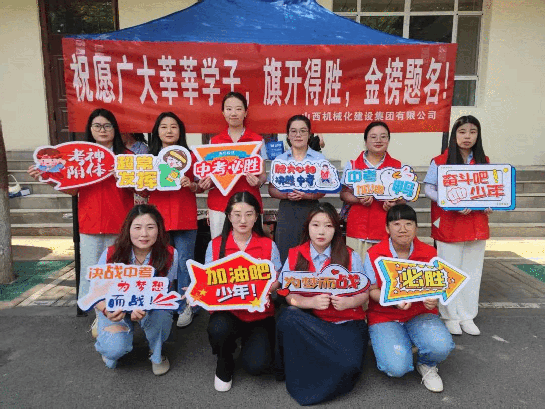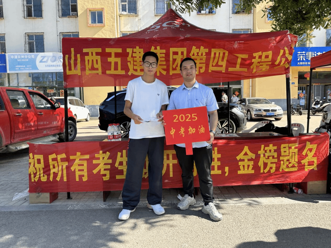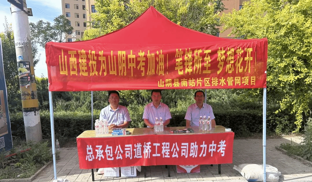 五建集团各基层单位、项目部在驻地考场周边积极开展助考服务。在朔州市应县一中考点,志愿者们提前搭建服务站,为考生及家长准备了矿泉水、藿香正气水等消暑物资。在大同市云州区考点,志愿者们手持“中考必胜”加油牌,为过往考生送上鼓励,帮助他们缓解考前压力。