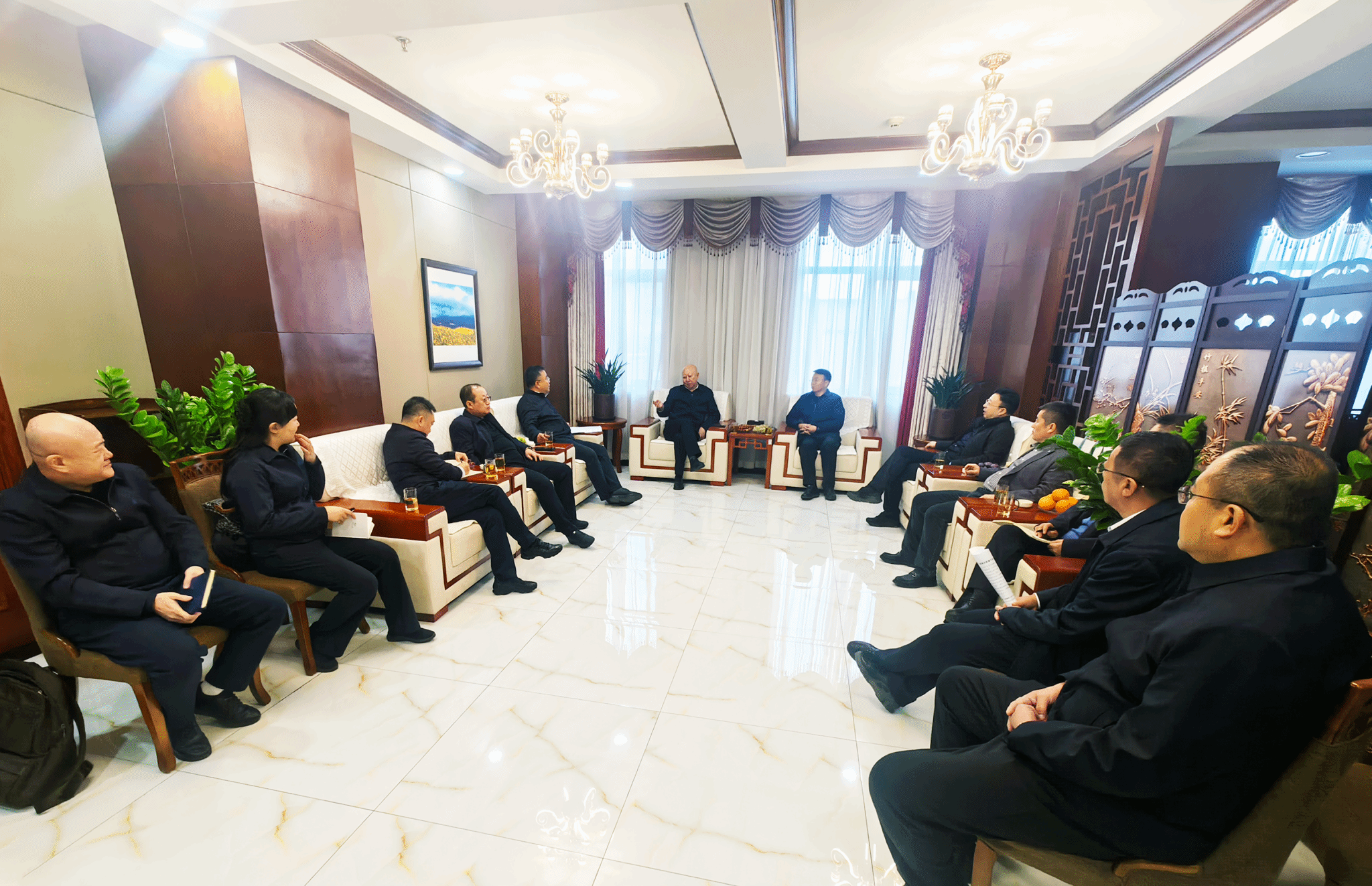山西省援疆前方指挥部临时党委委员、前指成员、临时纪委书记,昌吉州纪委副书记、监委副主任樊剑;山西省援疆前方指挥部临时党委委员、前指成员、办公室主任、项目资金部部长,昌吉州发展和改革委员会副主任白军伟;新疆维吾尔自治区发展和改革委员会电力处、援疆处、项目处相关负责人;新疆能源集团党委委员、副总经理王江峰,总经济师陆航和相关部门负责人;集团市场开发部、投资管理部、六建集团、机械化集团、建筑装饰公司、煤设院集团、建筑设计研究院相关负责人和有关属地单位负责人参加会谈。