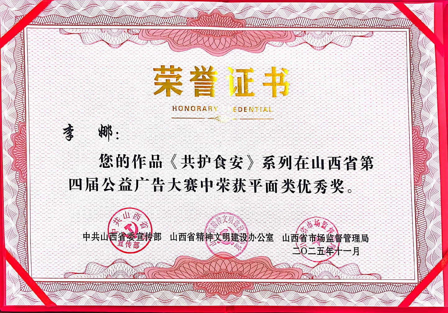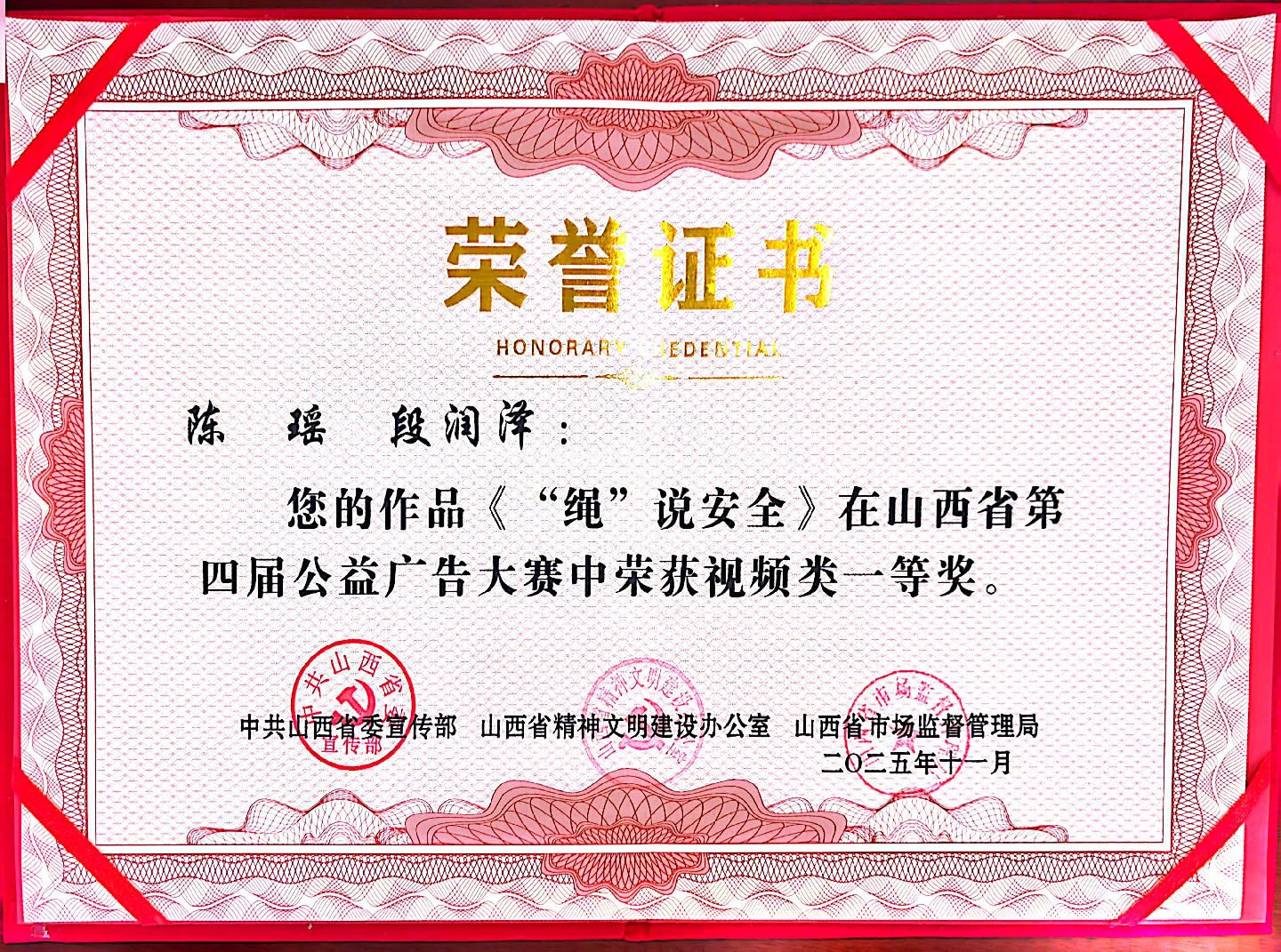 近日,山西省委宣传部、山西省精神文明建设办公室、山西省市场监督管理局联合主办的山西省第四届公益广告大赛获奖名单正式公布。山西建投选送的《“绳”说安全》《匠心·与时光同行》《共护食安》三个作品分别荣获视频类一等奖、三等奖和平面类优秀奖。