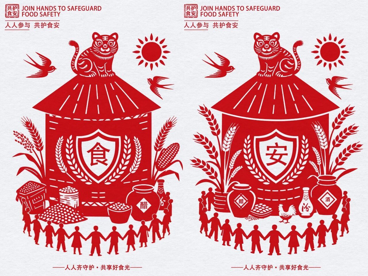 平面类作品《共护食安》以山西非物质文化遗产剪纸艺术为核心视觉载体,深度融合汾酒、老陈醋等极具辨识度的山西地域文化符号,巧妙植入粮仓、麦穗等象征粮食安全的元素,以及盾牌、老虎、携手人群等蕴含守护寓意的视觉意象,将“人人参与共护食品安全,共享山西美好食光”的核心理念具象化呈现。作品既生动诠释了食品安全关乎民生福祉、需要社会各界协同发力的深刻内涵,又让山西传统美学与现代食安主题同频共振,彰显了中华优秀传统文化的独特魅力与时代价值。