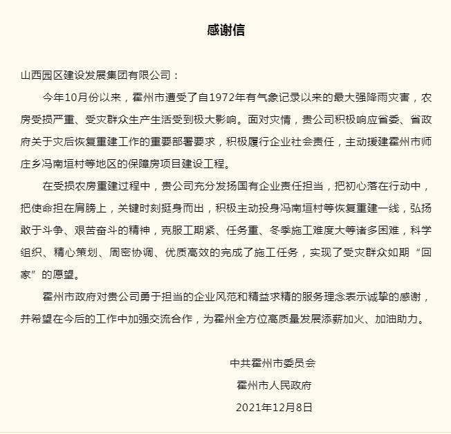 临近除夕,一度受灾破败的村庄展现出全新的容貌,一度愁容满面的村民们脸上又展现出甜蜜的笑容。在冯南垣村东口的照壁上,“共建美丽乡村共享美好生活”十二个大字在太阳的照耀下格外醒目,这是对此次灾后恢复重建工作的生动诠释,也反映出广大村民和参与恢复重建全体人员对未来生活的信心决心。与此同时,山西建投也收到了霍州市人民政府一封“沉甸甸”的感谢信。