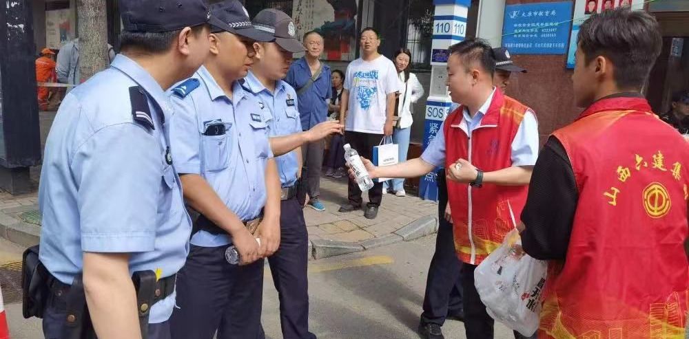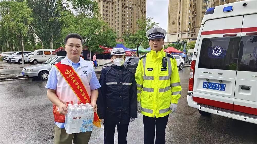 为守护在考场外的公安、交警等工作人员送上饮水,并全力协助交警在街头巷尾维持交通秩序,确保考生能够安全、快捷、顺利抵达考场。