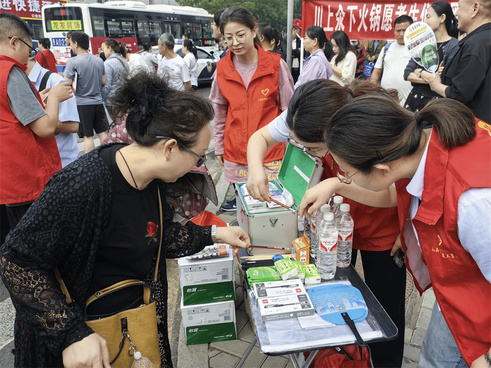 在考点外志愿服务站,为莘莘学子精心准备“爱心文具包”、干湿纸巾、矿泉水及藿香正气水、创可贴、碘伏、酒精等常用物品。