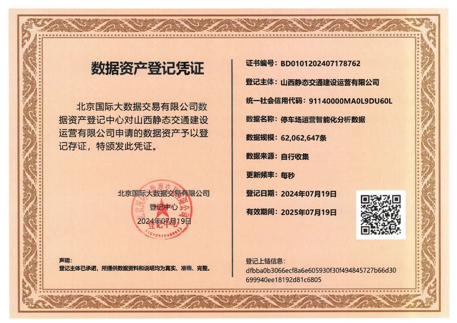 下属企业静态交通公司在北京国际大数据交易所完成停车场运营智能化分析数据资产登记,并完成数据资产入表,成为山西国资系统首个数据资产入表企业,实现山西静态交通领域数据资产入表零的突破。