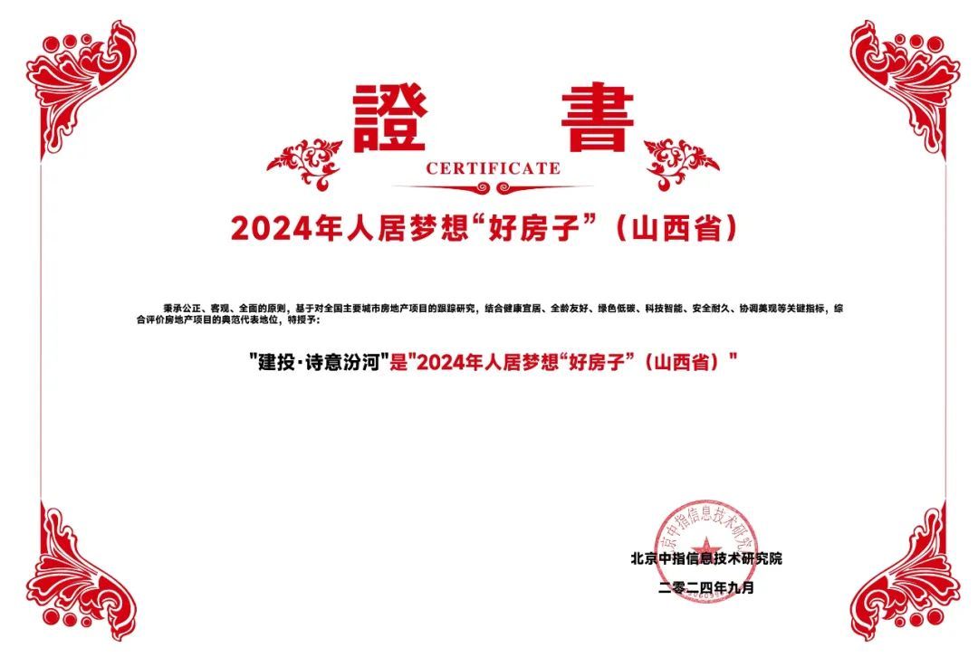 建投地产荣膺“2024中国房地产公司品牌价值TOP10(国企)”“2024中国房地产公司品牌价值TOP30”,建投地产打造的建投·誉河院项目荣获“2024房地产项目品牌价值T0P10”荣誉,建投·诗意汾河项目获评“2024年人居梦想‘好房子’”,成为高品质人居的典范代表。