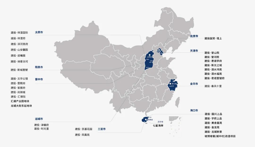 推出院系、府系、馆系、庐系、里系、城系、小镇系等7大住宅产品系和都汇系、智慧谷系、国际系、中心系等4大商业产品系,经营足迹涉及北京、天津、山西、浙江、江苏、海南等地。开发的天津南开区建投·誉山院、宝坻区建投·君诺学府、建投·君诺壹號府、浙江金华建投·春风十里、太原建投·诗意汾河等楼盘实现热销,投资建设的建投·祥澐国际项目创太原写字楼市场单盘销售最高纪录,获“中国百城建筑新地标”荣誉;建投·誉山院荣获具有“地产界奥斯卡”之称的TITAN多单元住宅建筑金奖,建投地产品牌影响力持续稳步提升。