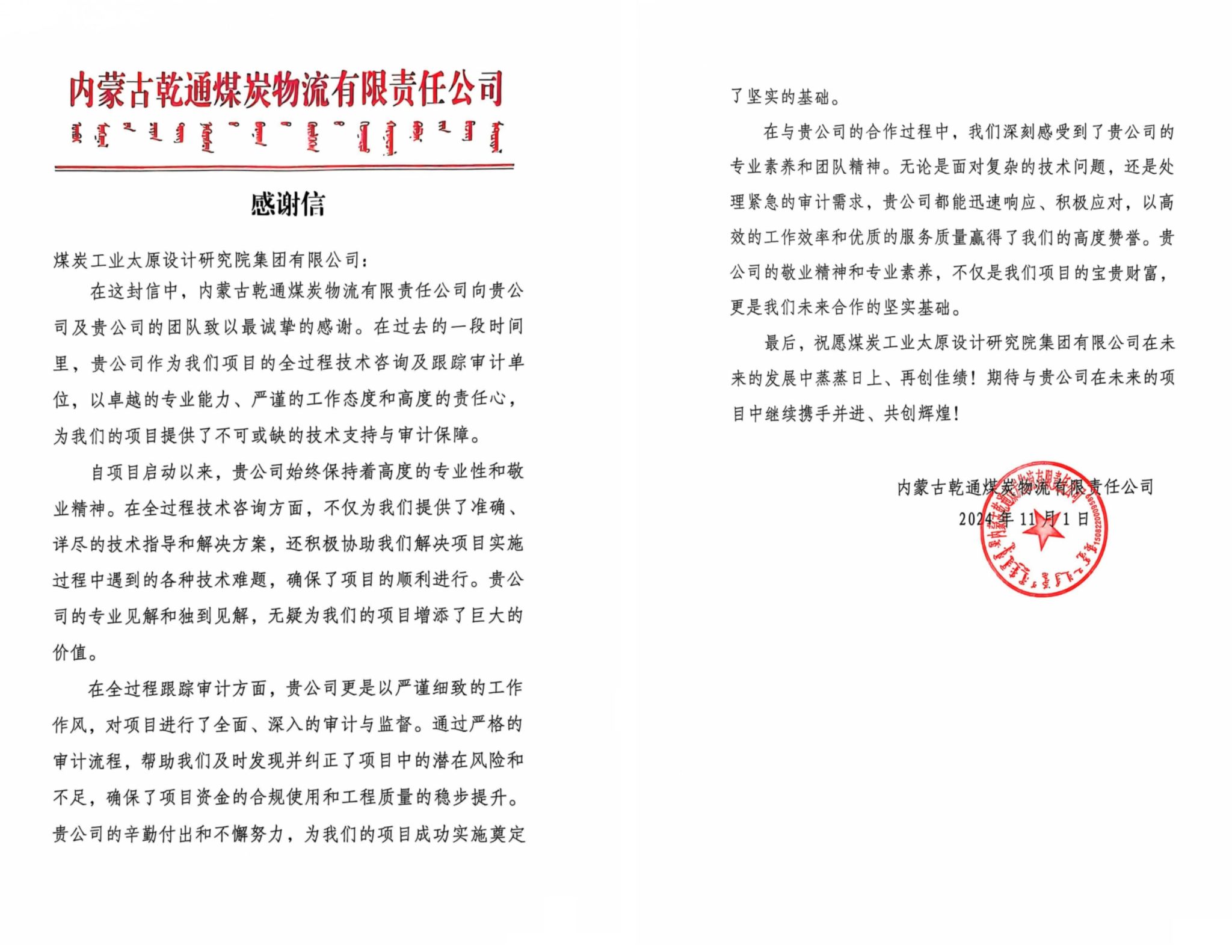 在11月1日收到的表扬信中,建设方对煤设院集团团队给予的专业技术指导和提供的准确详尽的解决方案表示衷心感谢,并对煤设院集团工作人员快速响应、积极应对、高效率工作和高质量服务的精神表示赞赏,表达了期待与企业继续深化合作,携手并进,实现共赢的美好愿景。