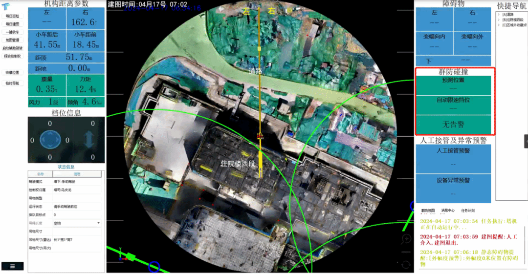 依托高精度激光雷达、传感器、人工智能、物联网、视觉重构等,先进设备与技术司机只需在地面上面对屏幕根据信息提示摇动手柄就可使塔式起重机精准流畅地将建筑材料吊装至指定施工点位。