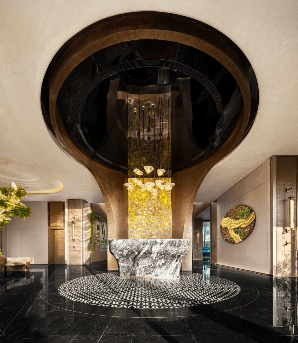 观瀑|接待区扇形的架构与渐变色调让人仿佛聆听到水流撞击岩石的声音,大理石接待台如山脉般坚实且充满韵律,主视墙流畅的纹理与纵深的层次感,宛如山水的波澜。