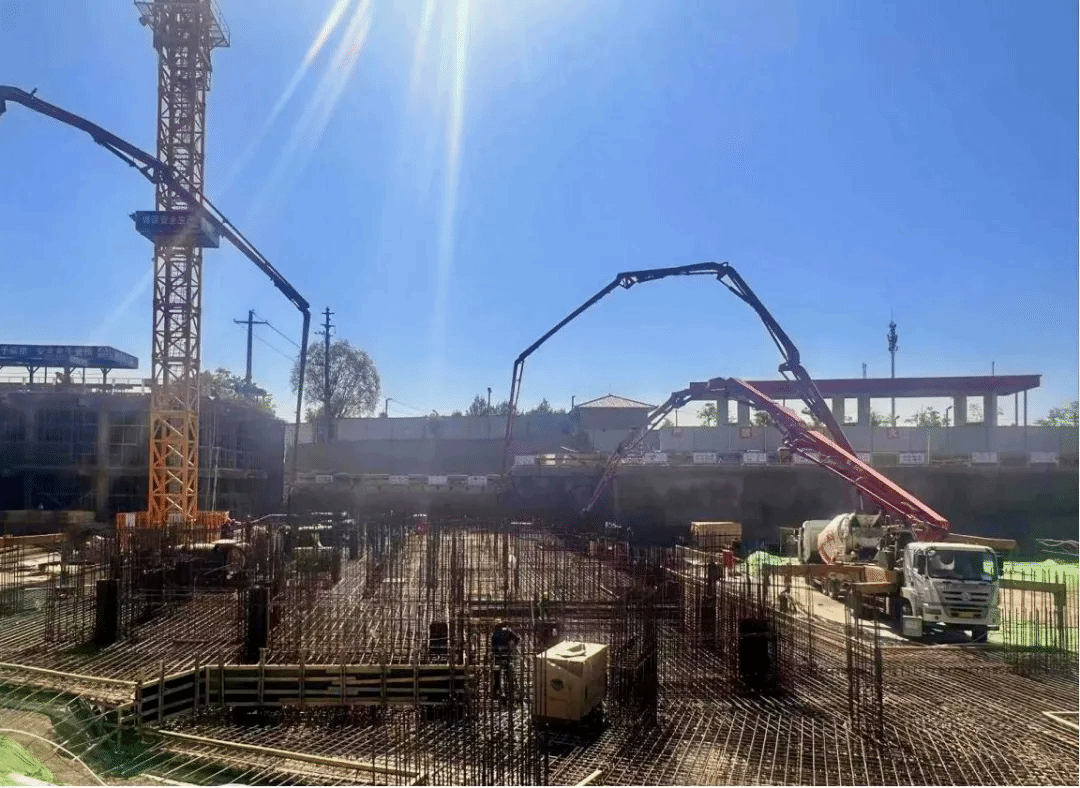 在面对筏板基础大体积混凝土浇筑难题时,项目党员先锋队成员分别与劳务分包方、材料供应方等人员召开专题会。重点围绕混凝土配合比优化、大体积混凝土温控措施、车辆运输调度、施工现场布置、道路通行保障、人员组织调配等关键环节,深入研究和模拟论证,逐一排除施工中遇到的各项难题。党员带领破题,为筏板浇筑制定了专属方案。浇筑当天,现场各党员分别负责协调3台汽车泵的同时作业,2条商砼生产线的不断供应和20台大型混凝土罐车的循环运输。在先锋队带领下,累计完成了260余车次、3800余立方米混凝土浇筑的任务,且一次成型,不留下一点施工缝。