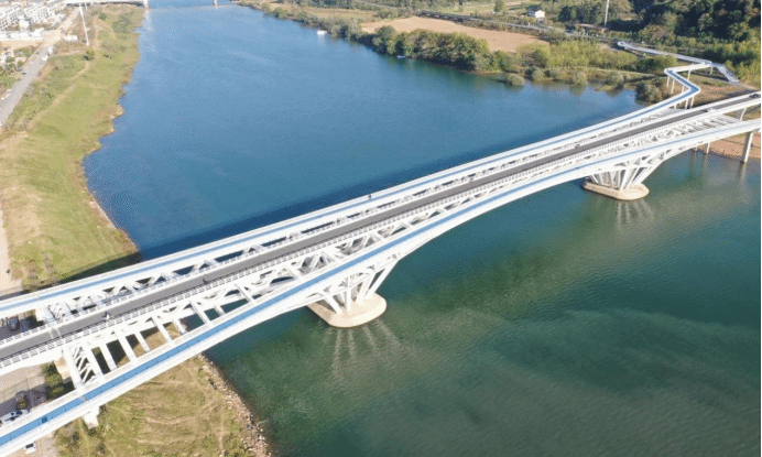 云碧峰大桥作为国内首座掌托型连续钢桁架刚构桥,集主桥车辆通行与辅桥行人、非机动车通行功能于一体。工程涵盖道路、桥梁、排水及景观、交通标志标线等附属设施,总投资2.32亿元。其中主桥长714米、宽8米,最大跨度120米;东西辅桥分别长643米、827米,各宽4.5米。大桥横跨上饶市信江,位于云碧峰公园北侧,是信江湿地公园核心出入口及连通云碧峰与湿地公园的标志性工程。作为上饶市“加环路”交通体系的关键节点,项目不仅完善了区域内外交通路网骨架,更优化了云碧峰森林公园生态休闲区交通布局,有效缓解城市拥堵,提升功能品质,为“大美上饶”建设与城市可持续发展注入强劲动能。