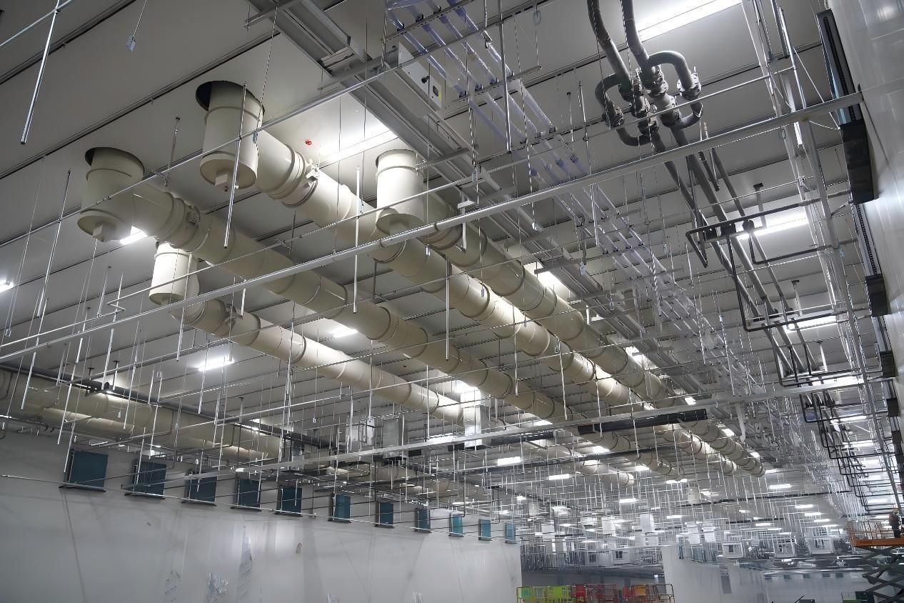面对12个月极限工期和300余项交叉工序的挑战,项目团队以效率提升为核心,创新实施“日清-周统筹”机制:每日早晚调度会紧盯节点、即时协调资源,每周复盘部署前瞻计划,确保当日偏差当日闭环,使管理效率提升50%。施工组织上采用“时间错峰+区域穿插”策略,动态优化各专业作业时序与空间,减少高峰期冲突75%;同时推行精细化网格管理,区域划分定人、定责、定区域,任务清晰责任到人,安装效率提高50%。空调风管与工艺管道模块化预制后统一吊装,减少现场作业量60%,柔性主风管设计化解吊装障碍,使整体工期缩短40%。这套组合拳最终保障了1号、2号厂房机电系统如期高标准投运。