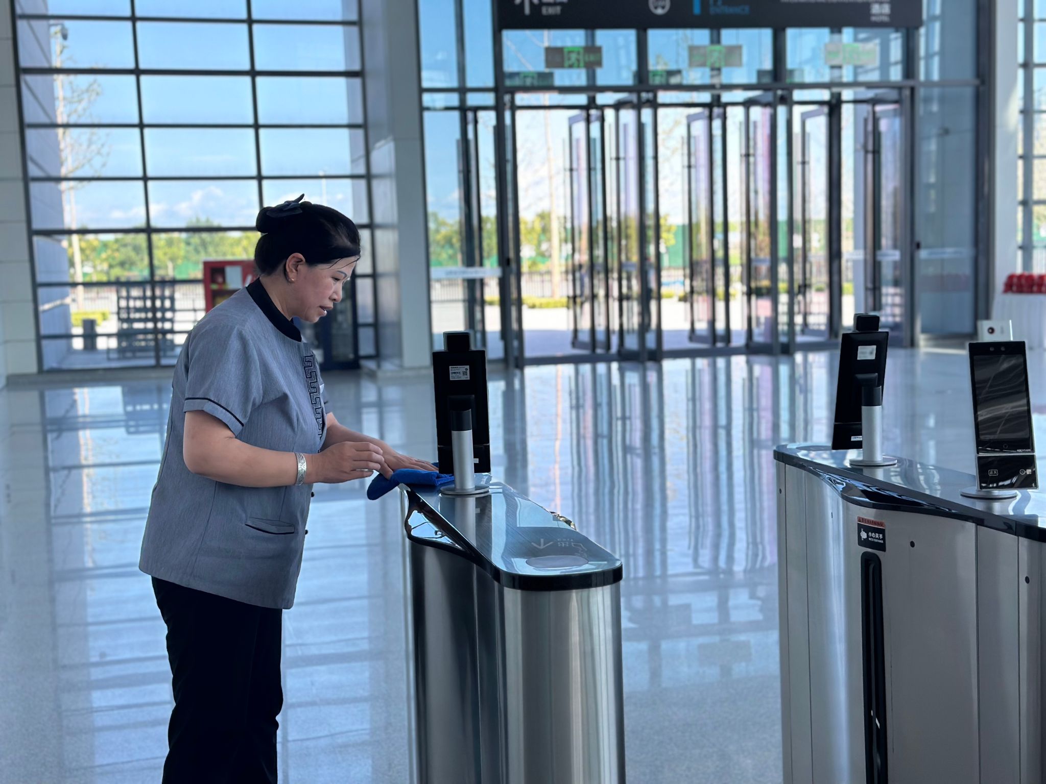 保洁团队提前10天对主会场、门廊、车库雨棚开展高空清洗,完成楼内绿植租摆及养护;对玻璃幕墙、石材墙面、外围地面、电梯、消防通道等开展集中精细化保洁,并于会前增加消杀频次,为大会提供安全舒适的场馆环境;展会期间,实施分区域、分时段清洁制度,对重点区域高频次清扫,并分类处理特殊垃圾,保持展馆环境整洁有序。
