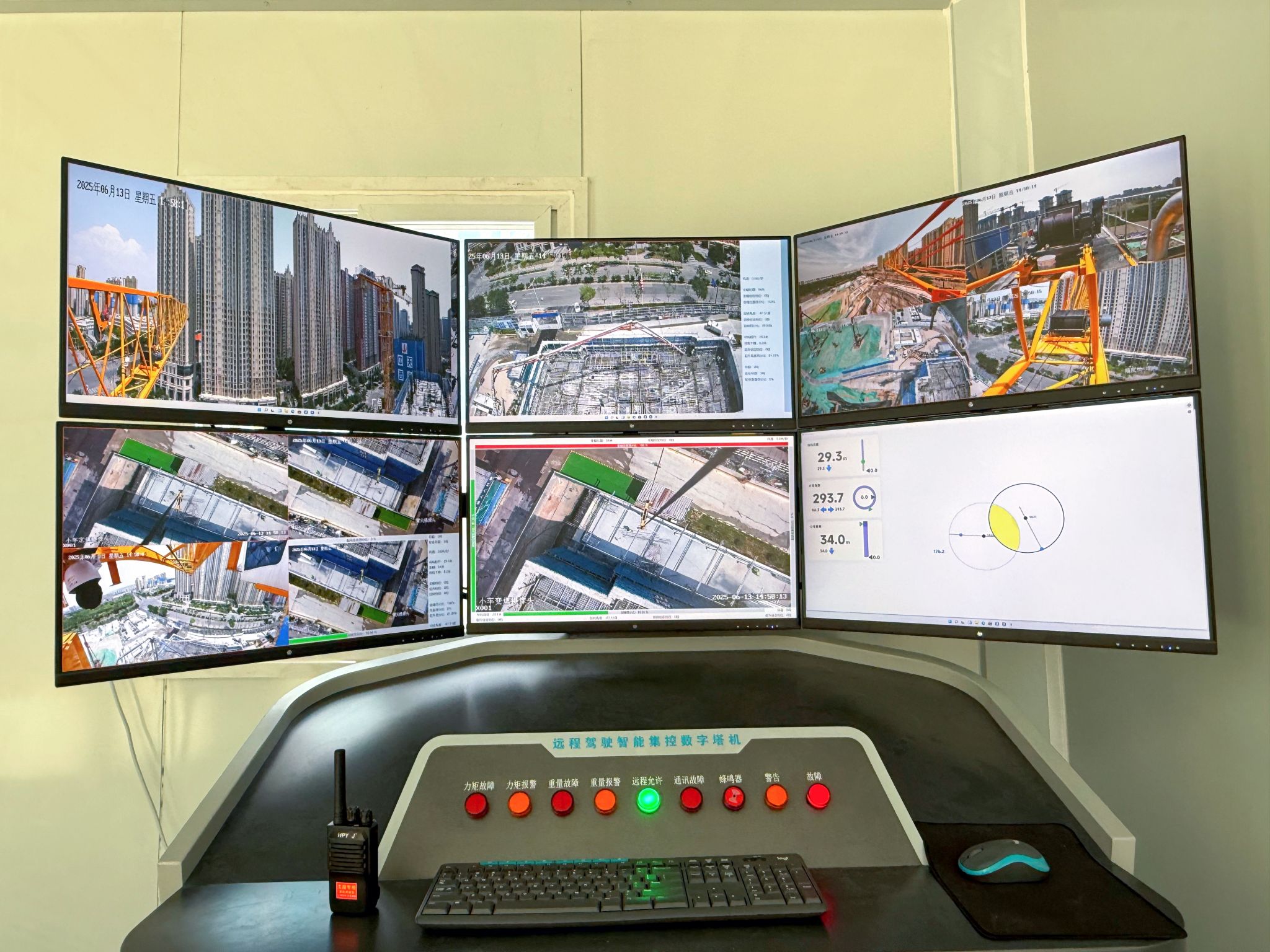 “双模式智能联动驾驶”技术实现了高空驾驶舱操作与地面远程操控的无缝切换。塔机司机既可在驾驶舱内开展传统高空作业,也可通过数字全景(5G)塔机集控驾驶舱,借助多块曲面巨幕实时传输的360°作业影像完成远程操作。这种灵活的操作切换,不仅改善了塔机司机的作业环境、优化了作业流程,更提升了操作的灵活性和响应速度,有效降低极端气候下的高空作业风险。