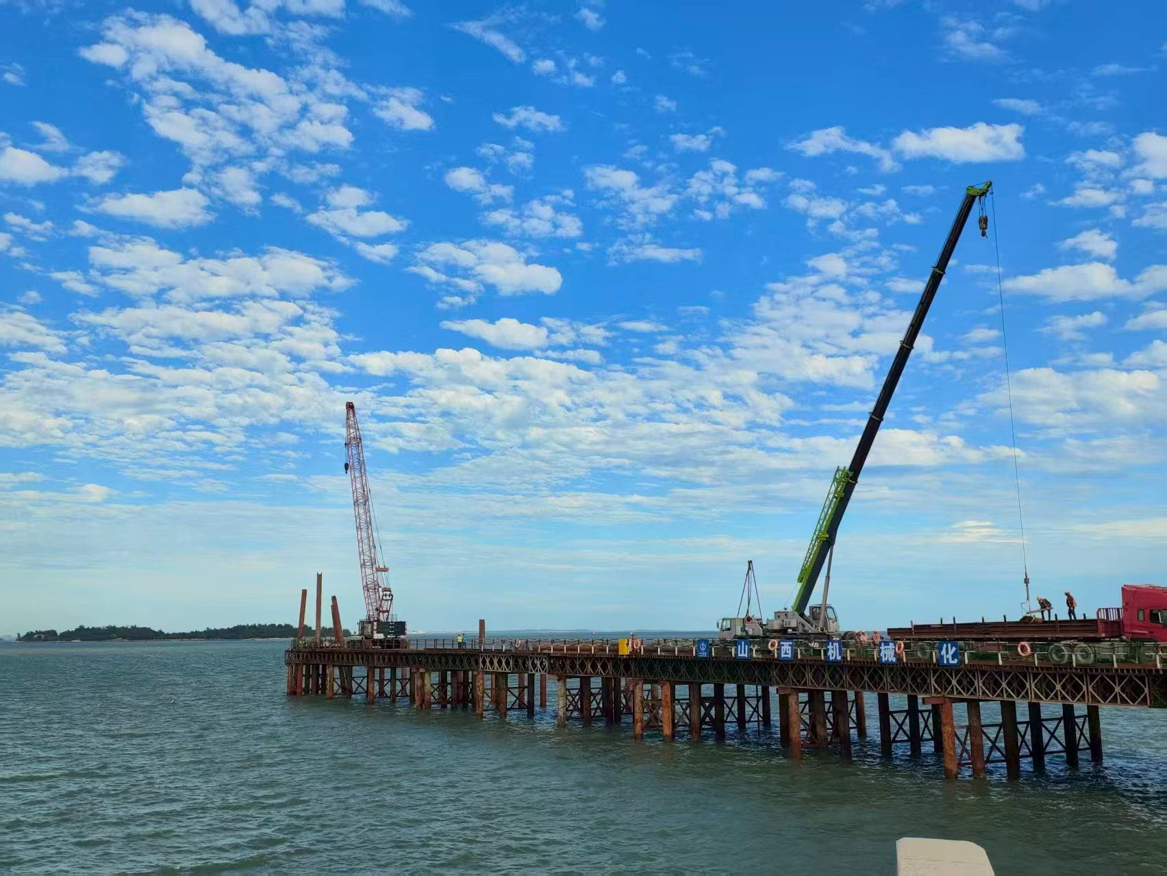 海上灯光栈桥作业中,项目团队创新运用BIM建模与数字红外线测距仪配合,在岸上远距离精准测放定位每一根钢管桩,既保障放线精度又确保人员安全;面对深海地质复杂、潮汐变化等挑战,通过分层钻芯取样研判岩层性质,依托全护筒钢围堰保障海上灌注桩质量;成功立项《机场海上引导航空器进近灯光栈桥桩基综合施工技术研究》课题,《海上灯光栈桥施工平台》发明专利、《一种海上施工栈桥装配式护栏装置》《一种海上平台打桩用定位装置》实用新型专利获国家知识产权局受理,填补了海上机场施工技术空白。