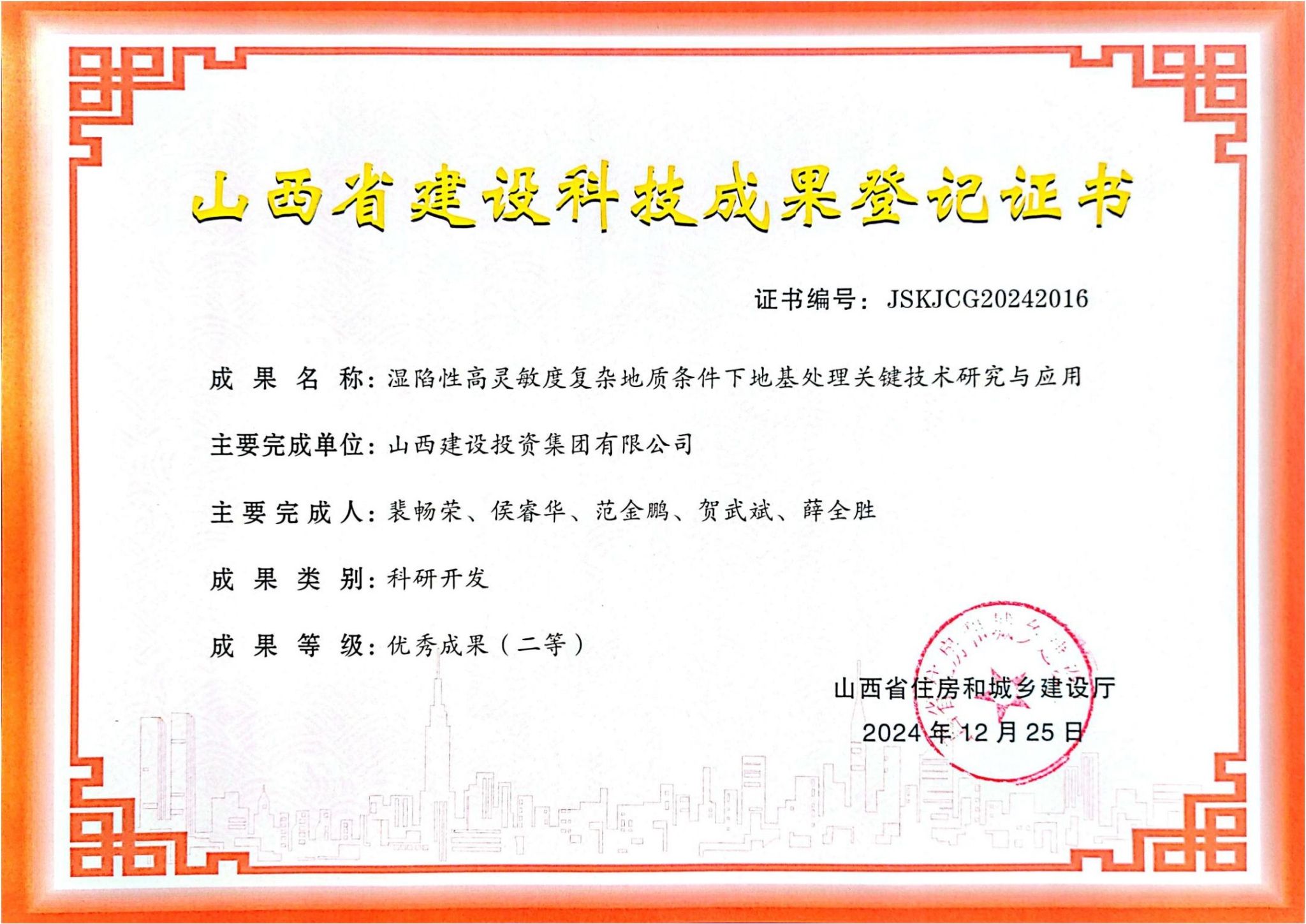 面对多重技术挑战,公司主动搭建校企合作平台,组建专项攻关小组,开展支护体系创新探索。技术团队深入分析地质勘察数据与现场试验结果,打破传统工艺局限,创新提出利用基坑外主体结构承台基础分担土体侧压力,以坑内承台短柱作为受力点构建反支撑体系的全新方案。为确保方案科学可行,技术人员选取现场条件较差的承台开展工艺试验,并联合第三方监测单位实时追踪基坑变形数据,通过对比承台水平推力与钢板桩水平位移的监测值与报警值,最终证实该方案可显著减小位移,有效保障施工安全。在团队的全力攻坚下,相关技术成功斩获发明专利2项、实用新型专利4项,总结形成的“湿陷性高灵敏度复杂地质条件下地基处理关键技术研究与应用”成果获评山西省建设科技成果登记优秀成果。