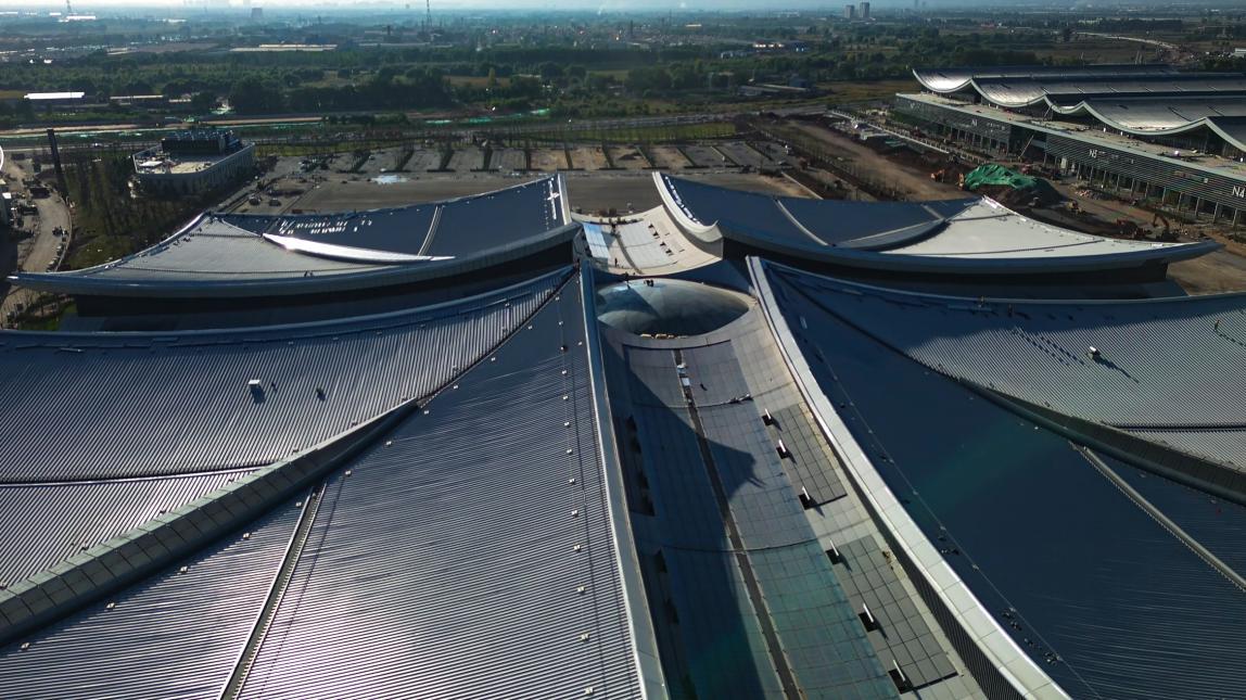 屋面施工则存在构件多、自重大,作业面高且无法搭设脚手架等难点。建筑外立面幕墙玻璃最大面积为10平方米,单位重量达800公斤,每条交通走廊的采光顶均由290块不同尺寸的异形玻璃组成,最大板块的玻璃弧长约4.7米,重350公斤,从龙骨到面层大部分施工都是通过吊车和高空作业车完成,施工高峰期最多投入了50余台高空作业车、剪刀车同时奋战。项目技术班组使用BIM技术提前精准下料,并创新研发出一套旋转式自动桁吊设备,有效提高了作业效率。