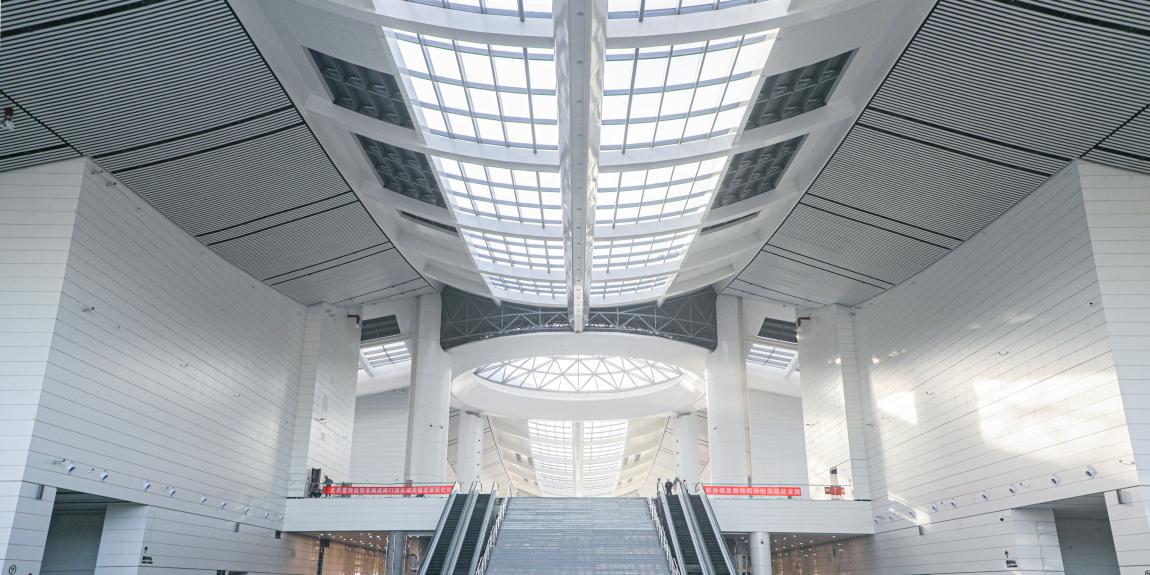 项目屋顶在设计阶段通过防坠落系统、融雪系统、虹吸雨排系统解决了屋面面积大、检修及排水困难等问题。项目技术班组通过建立BIM模型进行节点优化、指导加工下料,以技术保障实现预期效果。施工阶段采用了双曲面镀铝锌钢板金属屋面(不滑移)系统、直立锁边技术,有效提高了金属屋面整体性能,增强了屋面防水和抗风揭能力。十字交通厅及中心穹顶采用三维模拟分割、双曲夹胶玻璃加工、旋转桁架高空吊装、接缝防水等针对性技术和工艺措施,高质高效完成了异形双曲面单元玻璃板块的定制安装,从物理和心理双重层面实现了“凝心聚力”的设计理念。
