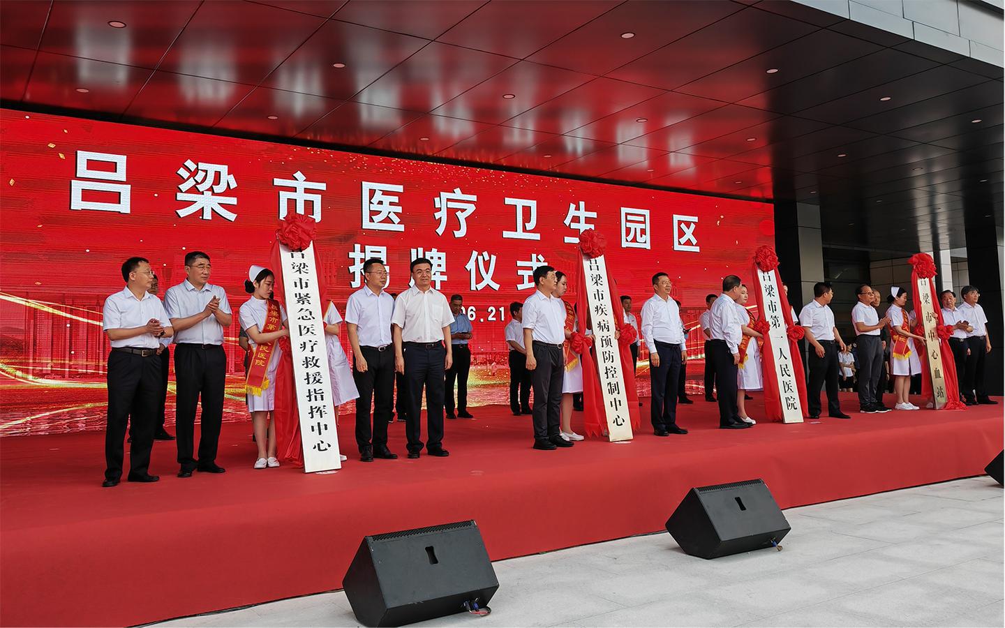 仪式上,吕梁市委书记孙大军,市委副书记、市长张广勇,省卫健委副主任阴彦祥,吕梁市市委常委、常务副市长任忠等领导共同为吕梁市第一人民医院、吕梁市疾病预防控制中心、吕梁市中心血站、吕梁市紧急医疗救援指挥中心揭牌,四家医疗卫生单位正式集中入驻园区,标志着吕梁医疗卫生事业实现了一次跨越式的发展。