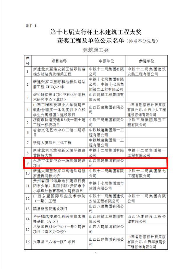 近日,从山西省土木建筑学会传来喜讯,公司承建的永济市体育中心一场三馆建设项目、朔州市科学技术馆、晋城市科技研发基地(科技企业孵化器)中试车间及中试车间地下室工程、万柏林区东社赞城城中村改造建设项目(一期)2#楼等四项工程荣获第十七届“太行杯”土木建筑工程大奖。