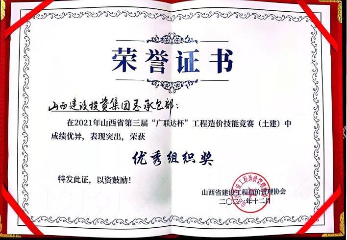 12月18日,由山西省建设工程造价管理协会主办的2021年山西省第三届“广联达杯”工程造价技能竞赛决赛在山西饭店举行。公司荣获安装专业组“团体一等奖”和“团体优秀组织奖”两项荣誉。