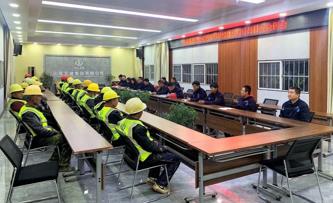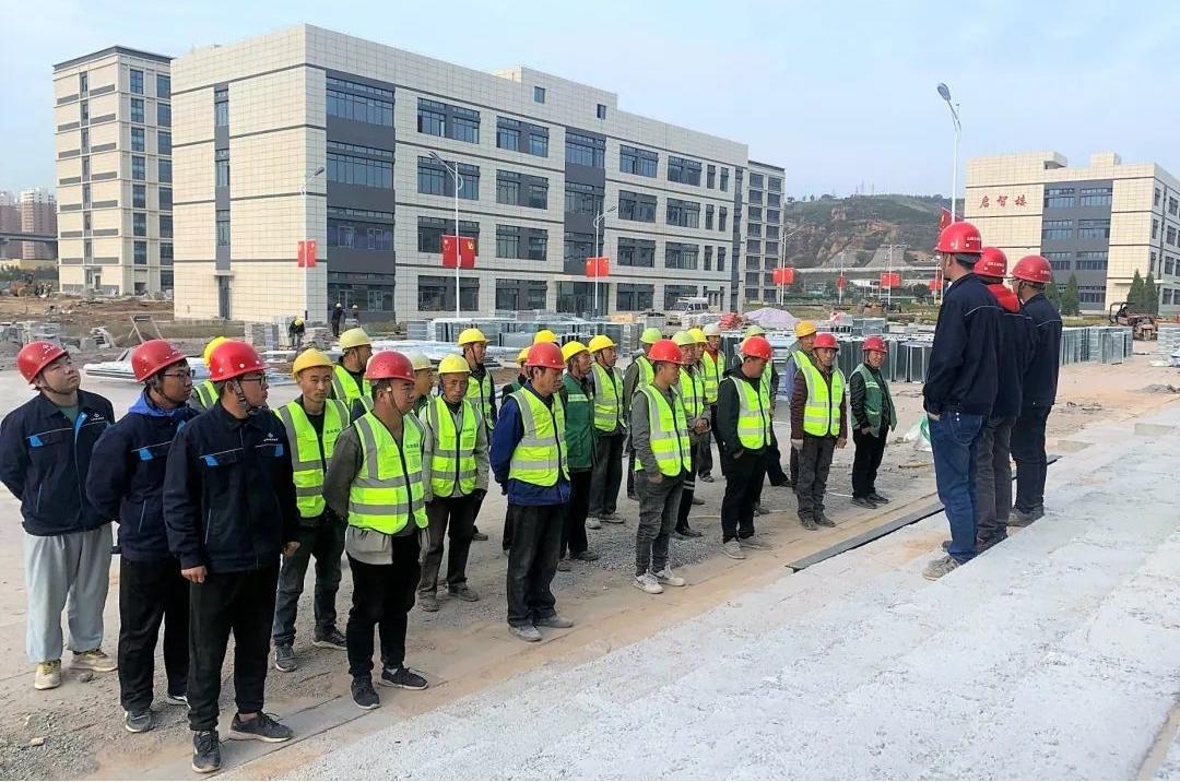 清晨,吕梁高等幼儿师范专科学校项目当班所有人员,穿好工服,整理完毕,开始了忙碌的一天。集合哨声响起,大伙已经列队站好。现场施工管理人员对当天作业的工友讲解作业安全注意事项,并对当天作业内容、作业环境以及现场存在的危险源进行安全技术交底。这是项目每日进行的班前安全教育,自项目开工以来,从未间断。