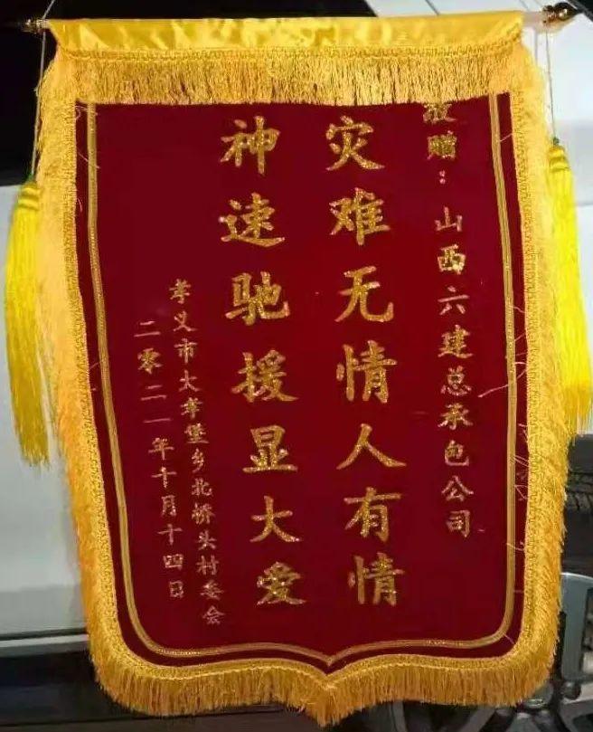 10月9日23时,六建集团总承包公司得知孝义市大孝堡镇北桥头村受灾严重,迅速组织防汛救灾爱心捐赠行动,不到半天时间,第二天中午就为村里捐赠了发电机1台、污水泵6台、水带225米、雨衣20件、雨鞋20双,并送到了村里。家住孝义市大孝堡镇北桥头村的员工梁月新自制爱心条幅,在捐赠物资的同时,帮助老乡提振信心,点燃希望!