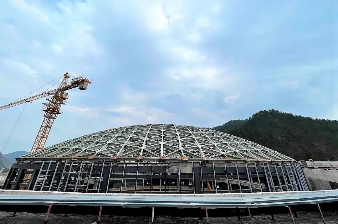 该工程位于交城县庞泉沟风景旅游区脚下,为山西省首个大跨度单层铝合金板式节点网壳结构。其三角形网格尺寸约2.5米*2.5米*2.5米,杆件采用6061-T6材质铝合金型材,截面为H300毫米*150毫米*8毫米*12毫米;节点盘采用6061-T6材质铝合金板材,板厚12毫米;节点采用304不锈钢专用螺栓连接。网壳跨度58.3米,矢高9米,周边多点支撑于钢梁与混凝土梁顶,支座标高18.3米。