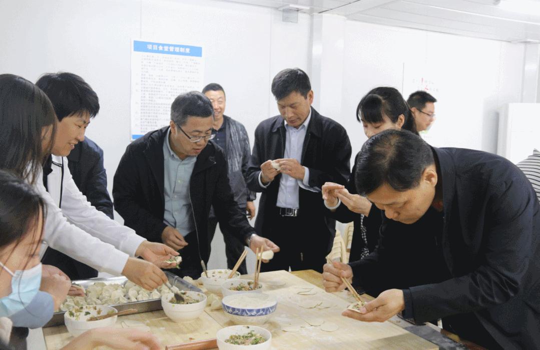 午餐时间,张增伏与慰问团成员在项目上和工人们一起包饺子、过“集体生日”。