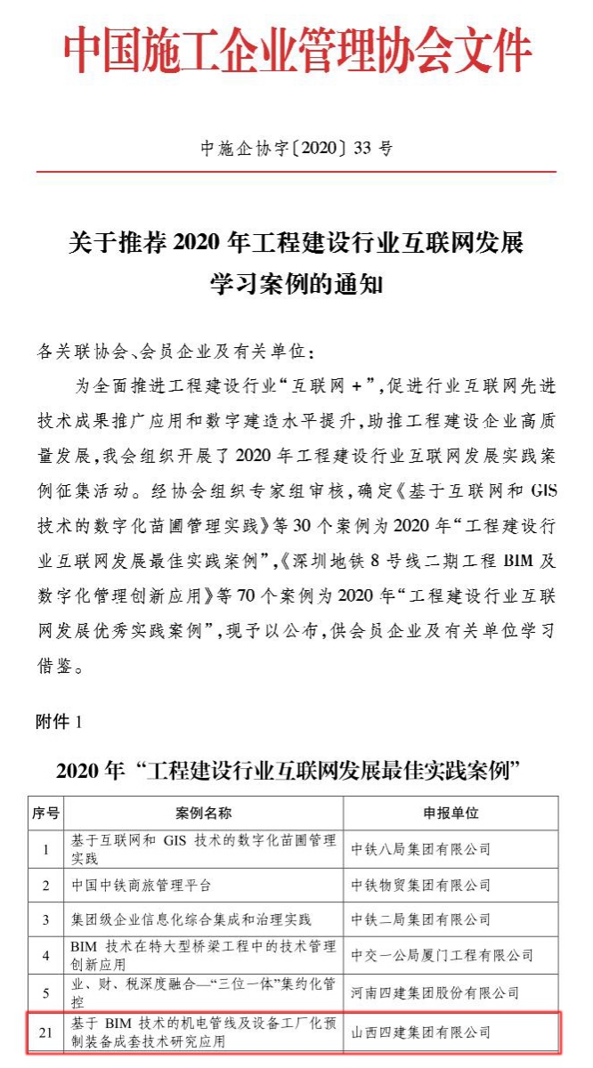 9月14日,由中国施工企业管理协会主办的第六届工程建设行业互联网大会在苏州召开,公司申报的《基于BIM技术的机电管线及设备工厂化预制装备成套技术研究应用》在会上荣获“2020年工程建设行业互联网发展最佳实践案例”,公司连续三年荣获中施企协工程建设行业优秀案例。
