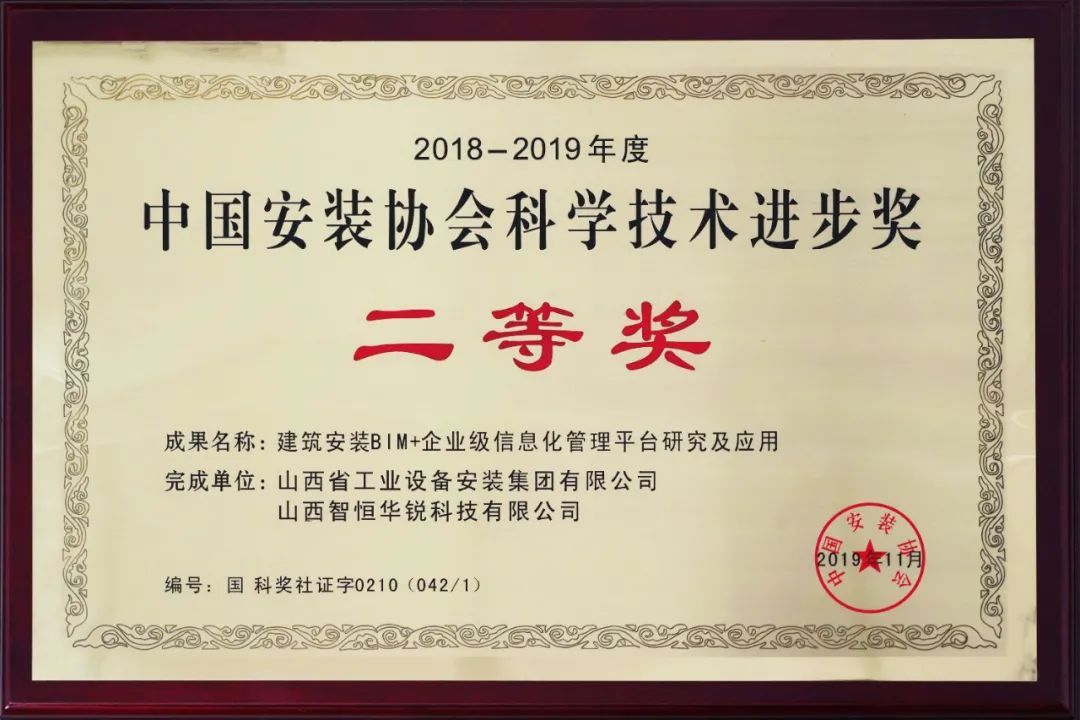 近日,公司四项科技成果荣获2018-2019年度中国安装协会科学技术进步奖。