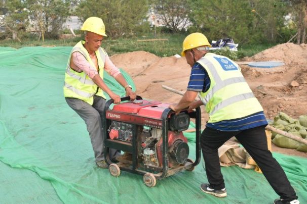 “开始演练!”随着演练总指挥刘云江一声令下,演练活动在龙城大街北侧东环南延k4+580-k4+640处正式开始。“报告领导,龙城大街北侧k4+580-640基坑挡水围堰破损,基坑涌入大量雨水!”洒水车开闸下起了“大雨”,防汛队员按照预案职责分工迅速行动,分别按照封锁基坑、抽水泵到位、开启发电机、组织抽水抢险、砂袋围堰和增援抢险物资六个项目,在警戒标志摆放、雨水设施开启、临时发电机组和提升泵架设安装等规范操作实施环节,严格按照规定标准,井然有序,所有人员精神高度集中投入演练,反应迅速,经过半小时的“战斗”,圆满完成演练任务。