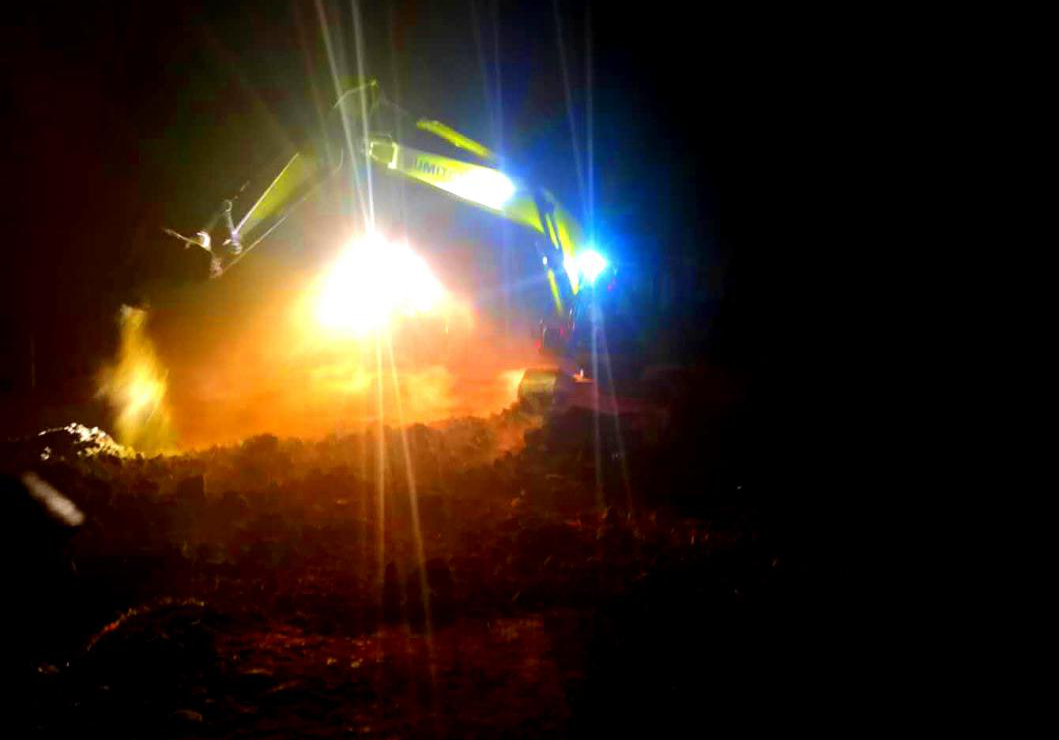在施工队伍连夜作业时,急降骤雨,大家冒雨与时间赛跑。由于火情点地形复杂,山林荆棘密布,施工条件十分苛刻,机械设备操作人员、现场管理人员累了就在挖掘机旁眯一会,饿了就吃包泡面抗一抗。