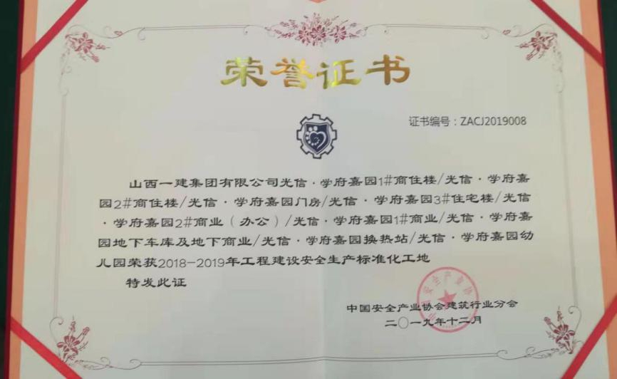 12月22日,中国安全生产协会建筑行业分会2019年年会在杭州举行。会上,对2019年安全生产先进单位进行了表彰,公司承建的光信·学府嘉园项目荣获“2018-2019年工程建设安全生产标准化工地”,第九分公司安全科李高平代表领奖。