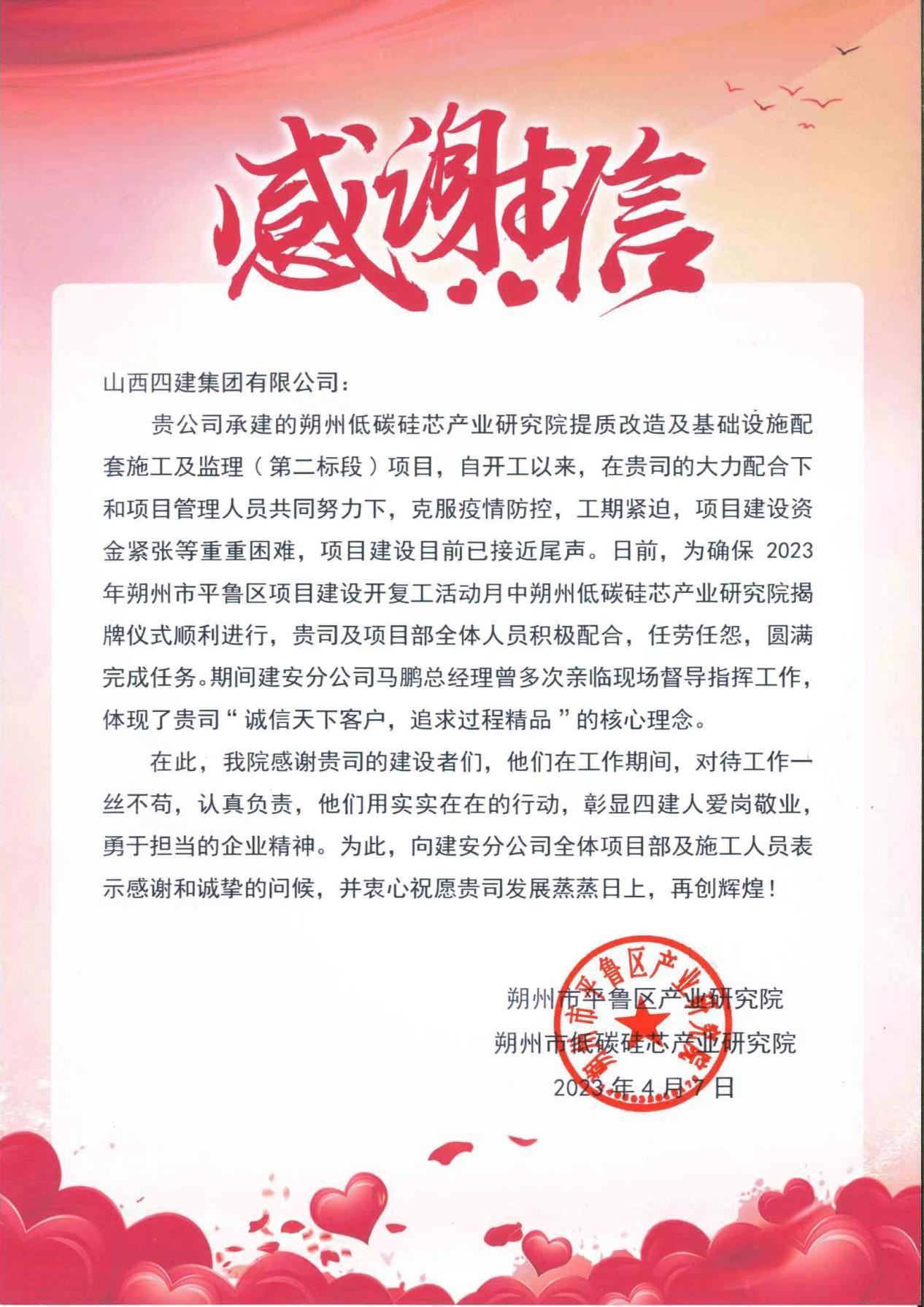 来自朔州市平鲁区产业研究院和朔州市低碳硅芯产业研究院的感谢信