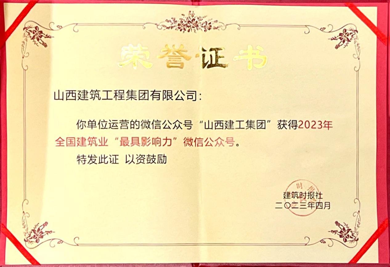 由建筑时报社主办的2023年建筑业微信公众号运维经验交流研讨会暨全国建筑业优秀公众号颁奖典礼在广西壮族自治区南宁市举办,“山西建工集团”微信公众号从全国参评的800余家建筑企业优秀微信公众号中脱颖而出,跻身100强,获评2023年全国建筑业“最具影响力”微信公众号。这是自建筑时报社2020年设立全国建筑业“最具影响力”微信公众号奖项以来,建工集团连续第四年获得该荣誉。建工集团将继续坚持正确舆论导向,规范运营管理,注重原创精品,构建有责任、有担当、有品质的内容生态,激励全员以高度的文化自觉和文化担当,推进“和·合”文化持久深入、落地生根。