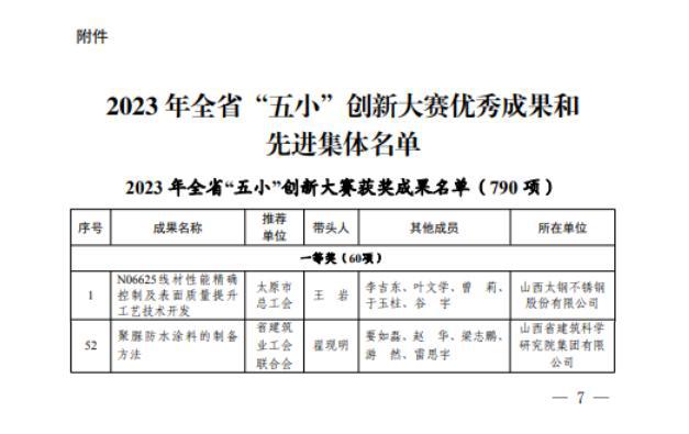 近日,由山西省总工会、共青团山西省委、山西省科学技术协会组织评选的山西省2023年“五小”创新大赛获奖名单揭晓,山西建投建科院公司申报的《聚脲防水涂料的制备方法》凭借独特的创新思维,在众多参赛作品中脱颖而出,荣获一等奖。