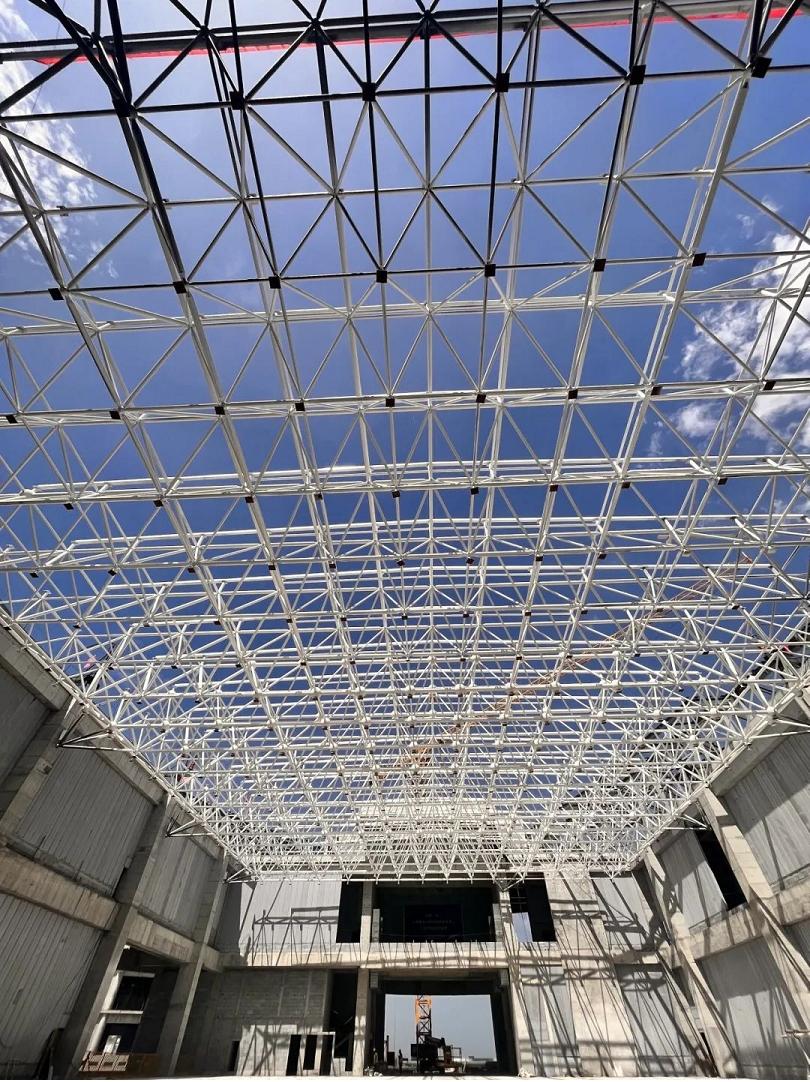 山阴县场馆建设项目会展中心采用正放四角锥螺栓球网架型式,上弦多点支承。通过预埋件成品球铰支座支承于混凝土结构,使用杆件3846根、焊接球133个、螺栓球620个。会展中心网架尺寸面积约3000平方米,矢高2.8米,总重213.4吨,提升重量200吨,提升高度12.9米。