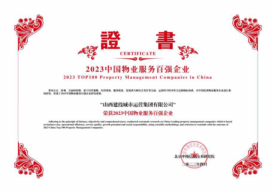 近日,2023中国物业服务百强企业研究成果发布会暨第十六届中国物业服务百强企业家论坛在北京召开,会上山西建投城市运营集团荣获“2023中国物业服务百强企业”。