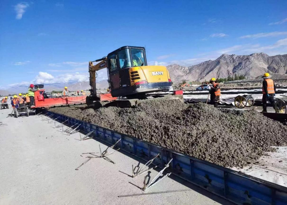 自开工以来,项目管理团队扎根在高原,拼搏在一线,牢牢抓住工程质量和施工安全两大核心,克服工程现场地下水位高、辫状河道交错分布、地基软弱土层多、岩层软硬复杂、施工便道横穿城镇国道,以及低压缺氧、恶劣的气候条件,生产运输交叉、有效施工期短等困难,仅20个月,便完成跑道铺设,充分展现机械化建设者们埋头苦干、锐意进取的工作作风。