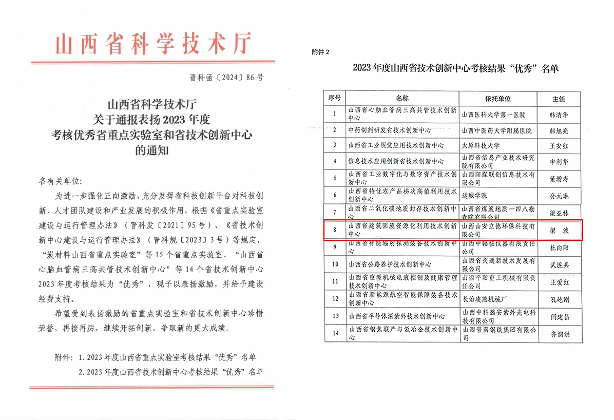 近日,山西省科学技术厅发布2023年度考核优秀省技术创新中心名单,山西建投安装集团牵头建设的山西省建筑固废资源化利用技术创新中心在年度考核中获得“优秀”,也是环境领域类全省唯一一个被评为优秀的科技创新平台。