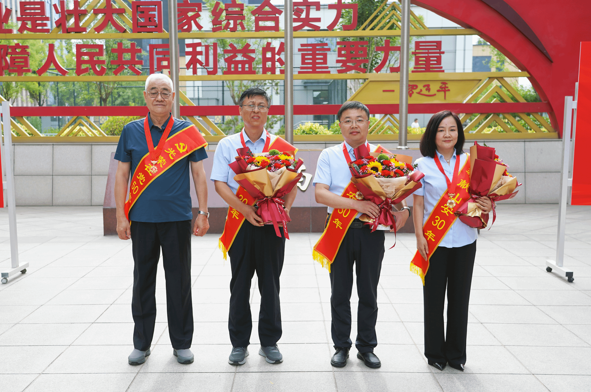 在“奉献山安30年”纪念章颁授仪式上,“光荣在党50年”纪念章获得者和德魁同志为王利民等“奉献山安30年”代表颁授纪念章。30年立足岗位,不辞劳苦;30年投身事业,实干担当。正是一个个山安人的“30年”,为企业在一路征程中阔步前行铸牢坚实根基。随后,和德魁同志与集团领导一同为新党员代表佩戴共产党员徽章。无私尽职30年的老山安人与整装待发的新一代山安青年,在“星引擎”广场上铺开历史与未来之间,两代人前赴后继、薪火相传的生动画卷。无论时代如何变迁,共产党人百折不挠、艰苦奋斗的本色不会改,山安人的铁军传统、“红星精神”不会变,广大党员干部职工将不忘初心、牢记使命、笃定实干,推动企业赓续高质量发展。