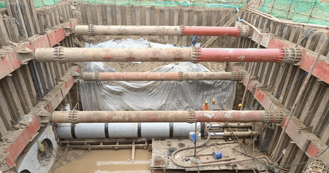 顶管单管长110米,基坑深度11.4米,管间距1.2米,顶管过程中相邻管道之间土层扰动影响较大,精度要求高。项目综合运用了红外线定位技术、经纬仪、全站仪和RTK定位仪等高精度测量工具,进行实时辅助测量,确保顶管方向精准无误。每向前顶进10米,即实施一次全面而细致的测量复核,确保施工精度。同时,对顶管机进行优化改造,在机头部位焊接高效破刀装置,通过松动机头前方的土层,有效减小顶进过程中的阻力与压力,促进泥浆顺利形成,显著提升顶管作业效率。