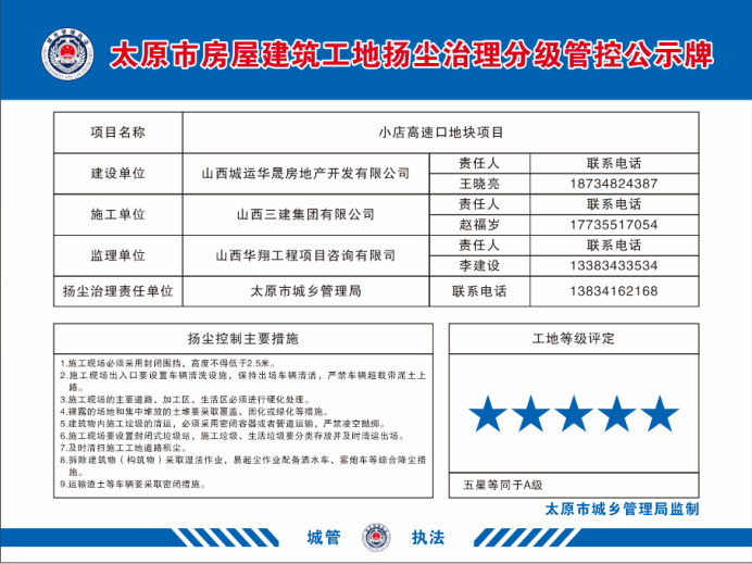 近日,太原市城乡管理综合行政执法队公布2024年第二轮房屋建筑工地扬尘治理评级结果,山西建投三建集团承建的小店高速口地块项目在210个参评施工单位中脱颖而出,获“五星工地”殊荣。