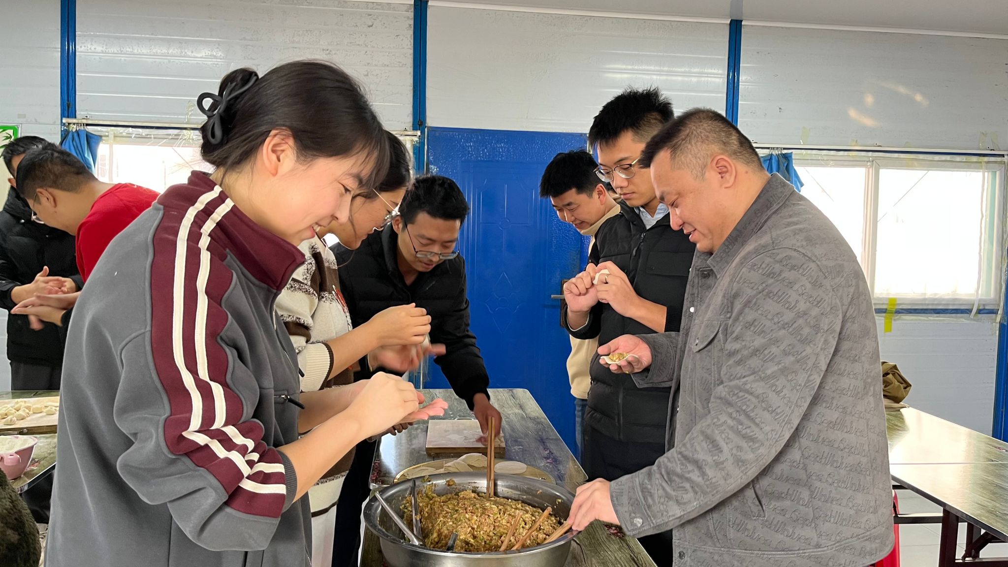 食堂厨师师傅们一大早就去菜市场采购新鲜肉类、蔬菜、佐料。各单位职工们齐聚食堂,放料调馅、和面、擀皮……一场关于饺子的盛宴徐徐展开。