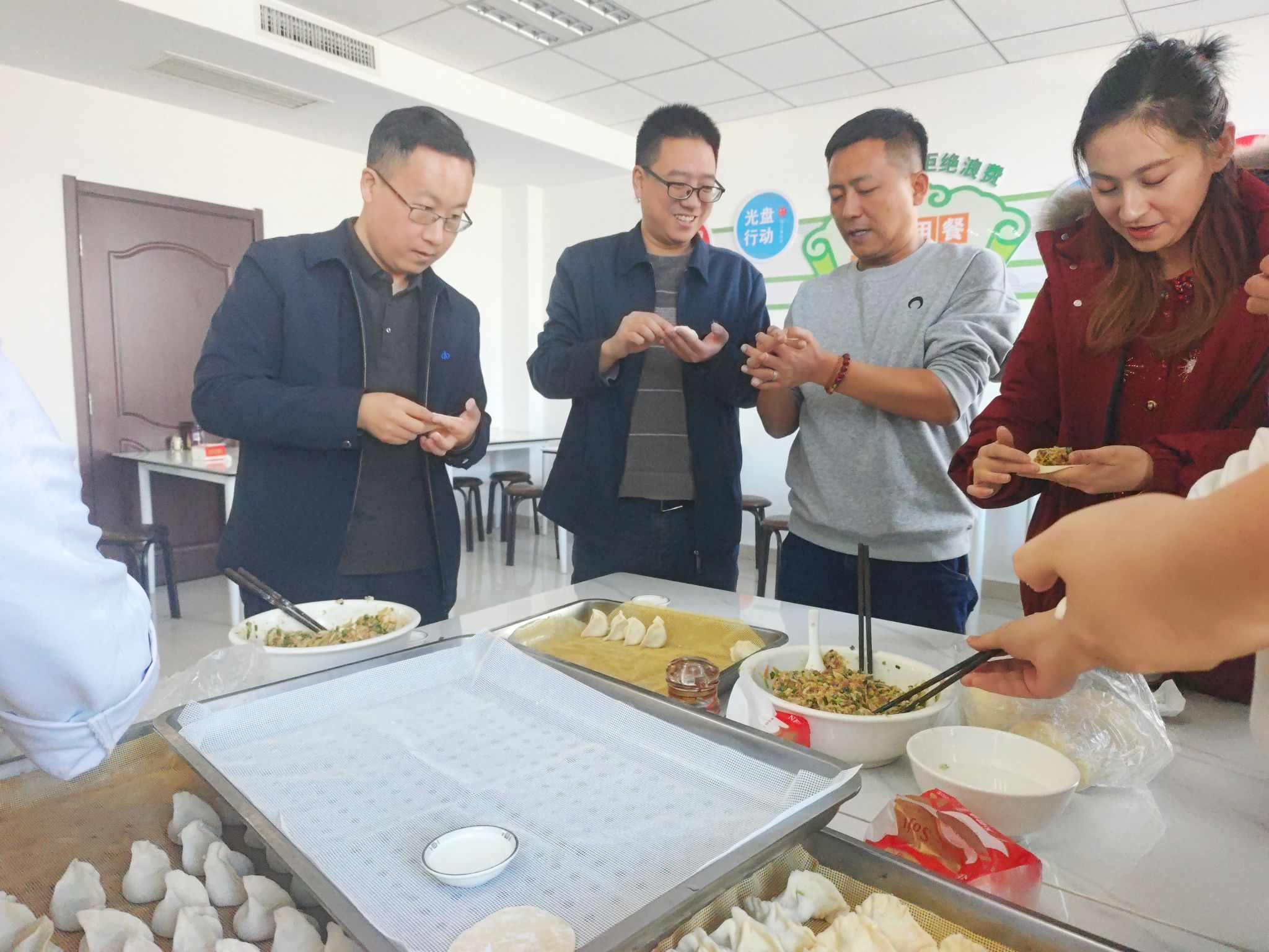 包饺子现场,大家全心投入,各显其能,配合默契,个个都变成“包饺子能手”,一合一捏之间,各式各样的饺子就成型了:有精致小巧的“柳叶”饺、有个大饱满的“包子”饺、有大圆肚的“元宝”饺,还有太阳般的“鼓”饺.......每个人的脸上都洋溢着灿烂的笑容,大家分工合作,互帮互教,一排排独具个性的饺子很快就摆满了一个个餐盘。每一个饺子都充满了员工认真、用心的态度,不同的饺子形象也寄托着公司和员工的共同希冀——愿公司发展蒸蒸日上,员工生活幸福美满。