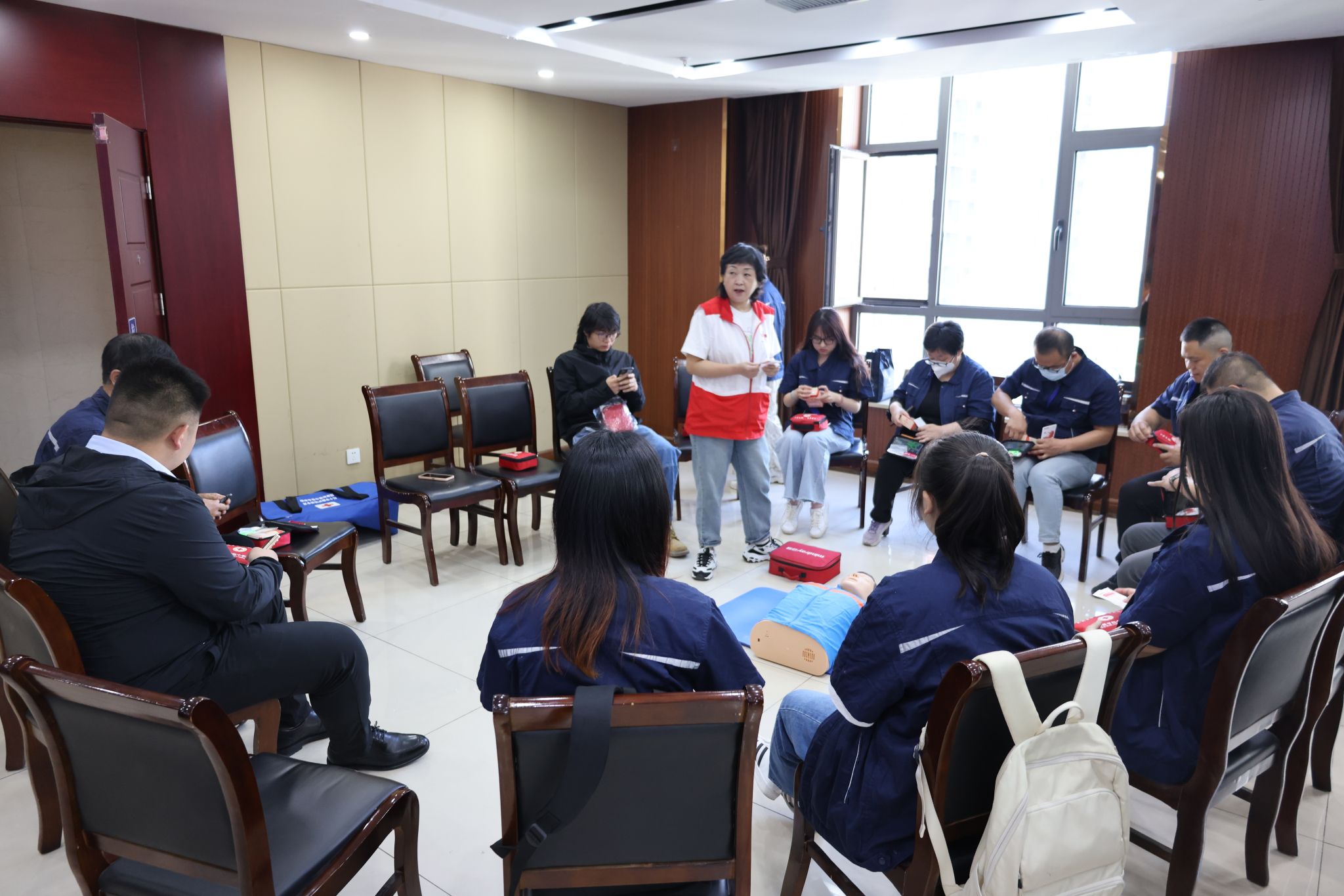 培训采取理论讲解与现场演示、互动教学相结合的方式,对红十字运动基本知识、救护概论、心肺复苏(CPR)、自动体外除颤仪的使用(AED使用)、创伤救护基本技能、气道异物梗阻处理等方面作了讲解。模拟练习让参训人员真切地体会到在紧急情况下,保持冷静、迅速反应的重要性,更加直观地感受和掌握急救措施的操作技巧和规范流程。